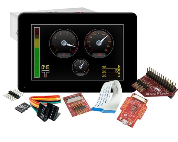 4D Systems SK-gen4-50D-CLB-PI Display Development Tools Starter Kit for gen4-uLCD-50D-CLB-PI with 4D Serial Pi Adaptor, 4D-UPA , 4GB Industrial microSD Card, 150 mm FFC Cable, 5-way female-to-female ribbon cable with male-to-male adaptor