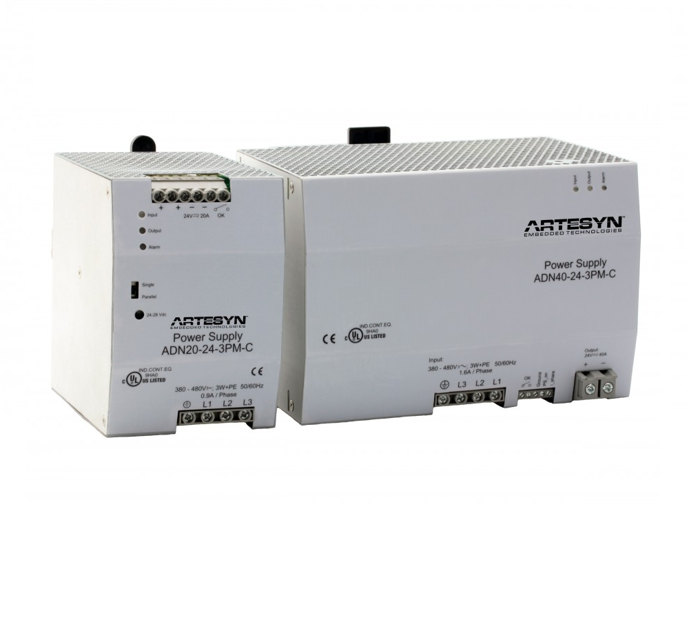 Phase input: ADN5 and ADN10 will operate with single phase input at 100% load Derate to 75% and 50% for ADN20 and ADN40 respectively under loss of 1 phase; Units will shut down if thermal threshold is exceeded under this condition