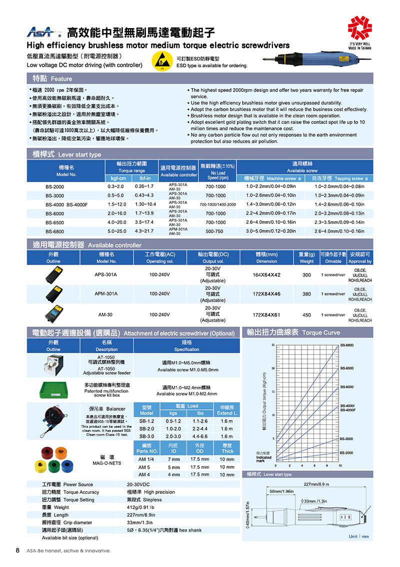 ASA BS-6500 Full-auto shut off electric screwdriver - Brushless motor (4.0-20.0kgf-cm, 1/4") | EMIN.CO.ID