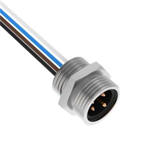 Banner Engineering MBC-4 Standard Circular Connector Mini-style QD Receptacle; 4-pin Male Pin-out Straight Connector; Wire Length: 300 mm (12 in); Chrome-Plated Brass Housing