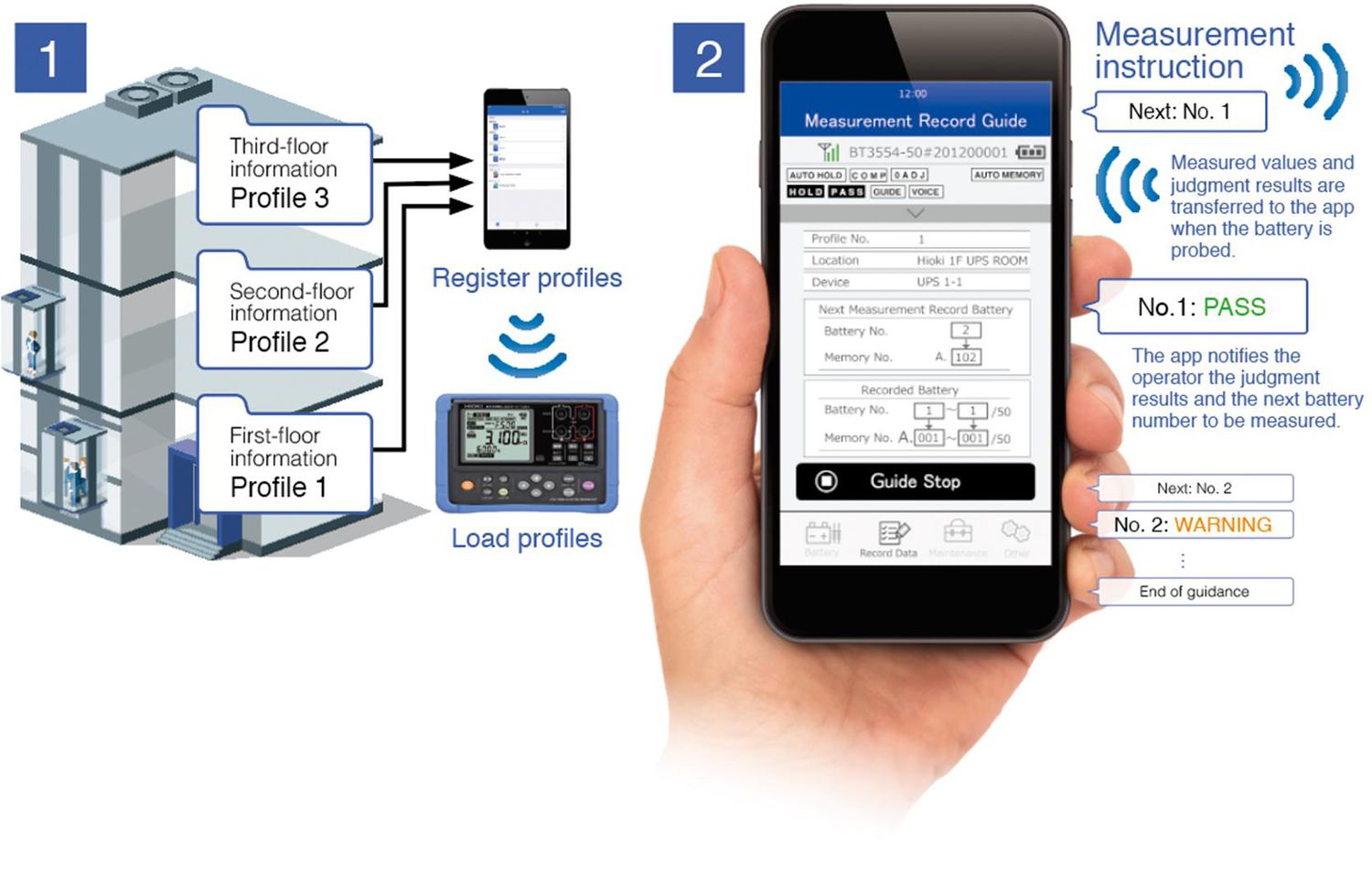 When the BT3554-50 is paired with a dedicated mobile app (GENNECT Cross), the mobile device will provide audio guidance announcing the next battery number to be measured. This feature helps prevent erroneous measurements. You can also set up measurement locations informations and battery numbers in advance to create profiles to which measurement data and diagnostic results will be linked. This capability simplifies data management, even when performing diagnostic work on large numbers of batteries.