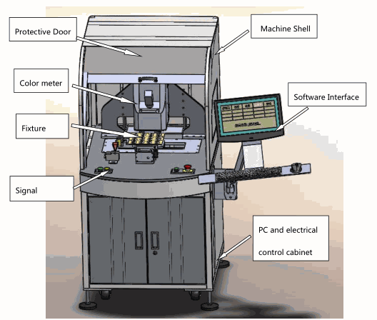 BEVS 3212 NCACM machine is mainly composed of color measurement module, XY axis module, sample fixture, software interface display, PC case and electrical control cabinet. The color measurement module is composed of a spectrophotometer and a Z-axis motion module. The spectrophotometer is installed in the Z-axis module. The control system can control the upper and lower motion. The sample fixture is fixed on the XY-axis module. The control system can control the movement of the sample fixture at any point on the XY-axis plane.