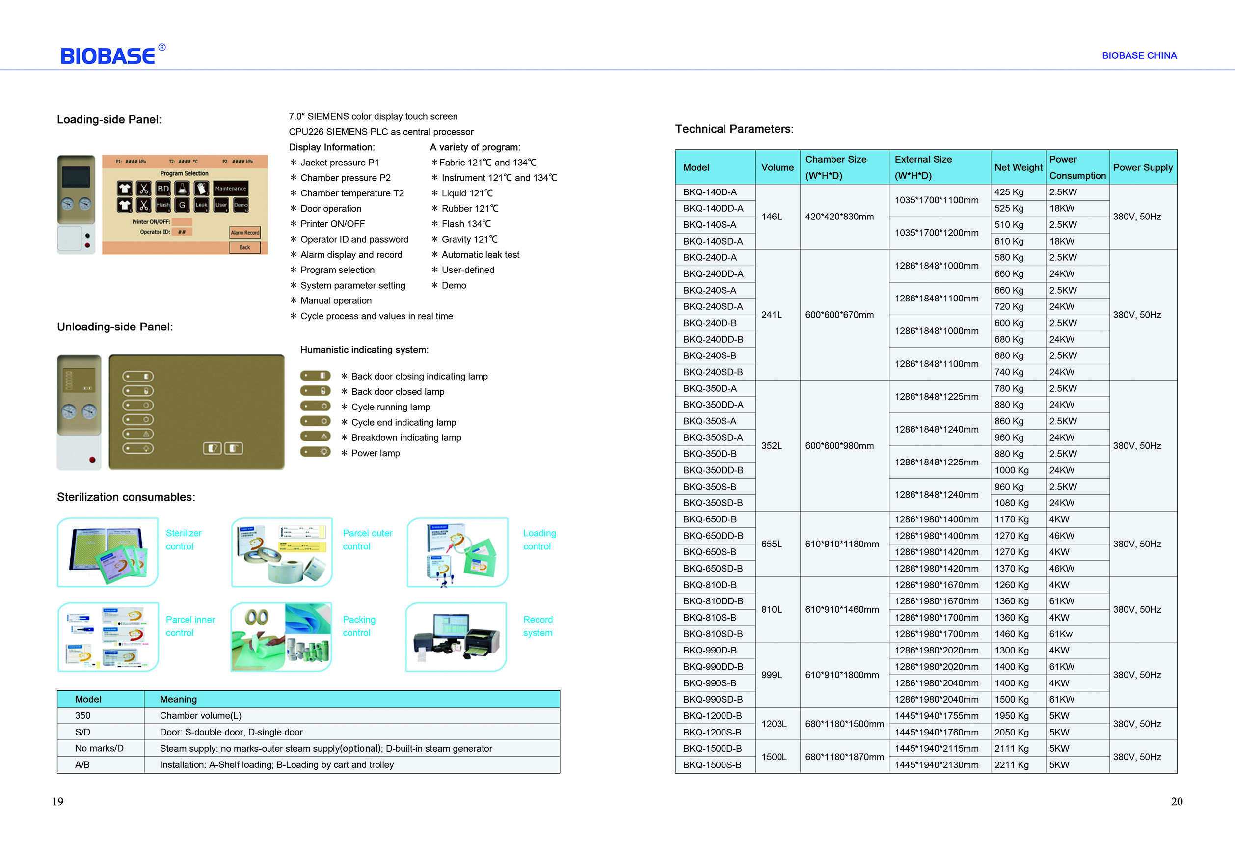 - Colorful touch screen on loading-side, 6 indicating lamps on unloading sides, which are concise, vivid and exactly showing sterilizing running status and alarming information.