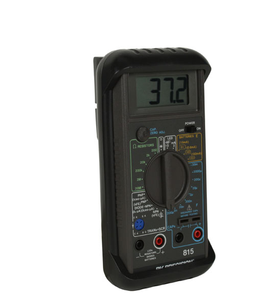 This handy capacitance meter (0.1 pF to 20 mF) and ohm meter (0.1 ohm to 20M ohm) also tests: transistors, beta, diodes, SCRs, LEDs and batteries.