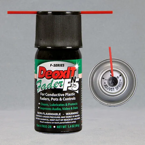 - Notes: Use when over spray is an issue. Formulation safe on plastics. Always recommend testing for compatibility, especially on critical/sensitive parts, and vintage equipment with aging ABS plastic(s). Will not swell rubber. For more flushing action and non-critical applications, we recommend Part Nos. F5S-H6. Need more tactile feel, use the DeoxIT® Fader Grease after cleaning with DeoxIT® Fader F-Series.