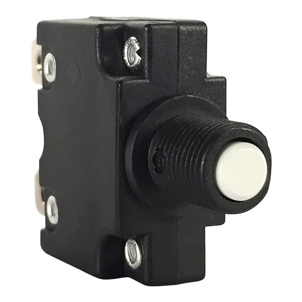 Carling Technologies CMB-153-27GNN-W-A Thermal 1-pole, Miniature Push-To-Reset Button, 125-250 VAC/ 32 VDC 15 amp circuit breaker, interrupting capacity 0.250 Tab (Q.C.) terminals 3/8" 27 UNS Front Panel Plastic Bushing UL 1077 Recognized cUL UL 1500 Recognized