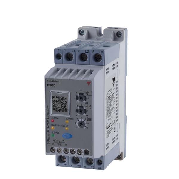 Carlo Gavazzi RSGD4012E0VD200 Motor Drives 3 phase soft starter for induction motors, Operating voltage (Ue): 220 - 400 Vac , Rated current (Ie): 12 Aac, Control voltage (Uc): 110 - 400 Vac , DIN rail, Supply voltage (Us): Internal, 2-phase control, 2 relay outputs