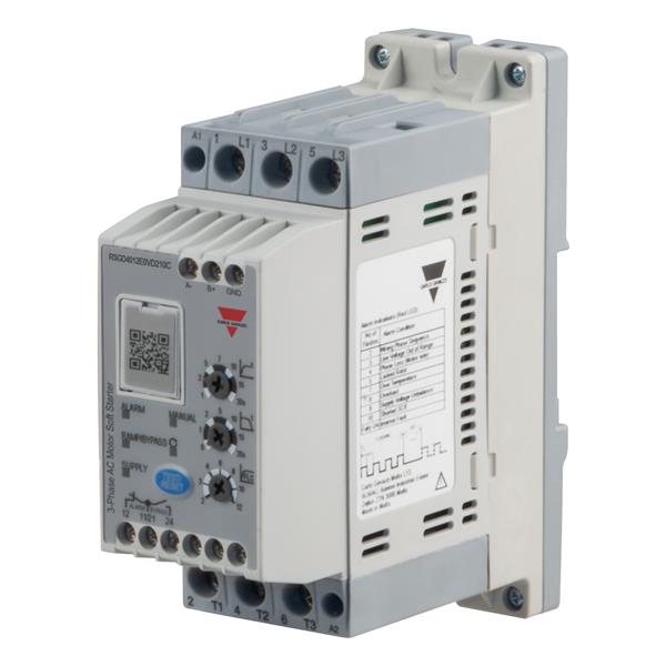 Carlo Gavazzi RSGD6012GGVD210C Motor Drives 3 phase soft starter for induction motors, Operating voltage (Ue): 220 - 600 Vac , Rated current (Ie): 12 Aac, Control voltage (Uc): 100 - 240 Vac/dc , DIN rail mount, Supply voltage (Us): 100 - 240 Vac/dc , 2-phase control, Class 10 overload, Modbus