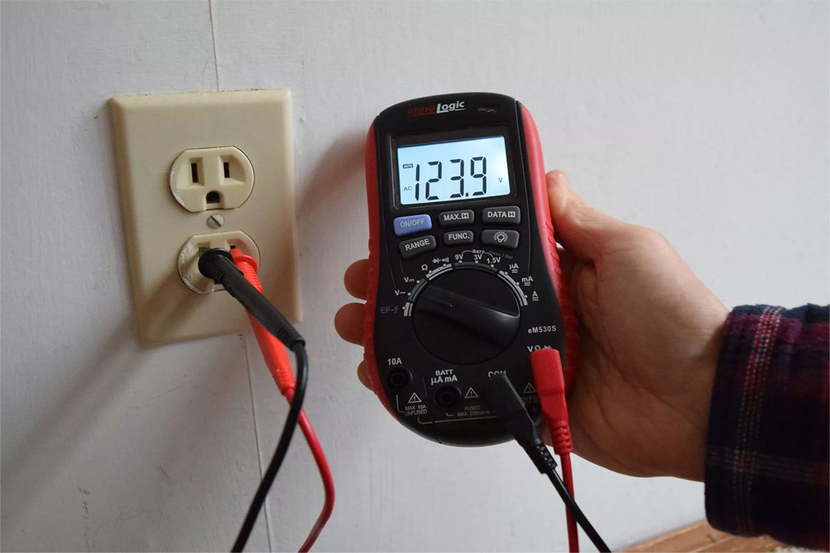 Before measuring live voltage, touch the two probes together in continuity mode to ensure the leads are intact. Then switch to AC voltage mode (V~).