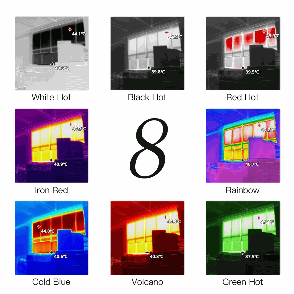 Palette: Iron red、white hot、black hot、rainbow, red hot、high contrast、green hot、volcano