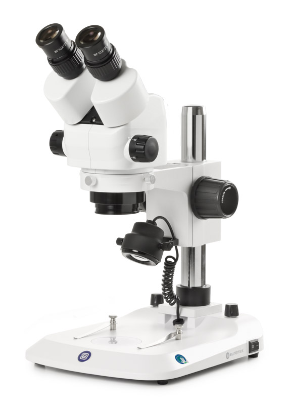 Ergonomically pillar stand. Maximum object height 193 mm. Supplied with black/white stage plate, transparent plate and 2 object clamps