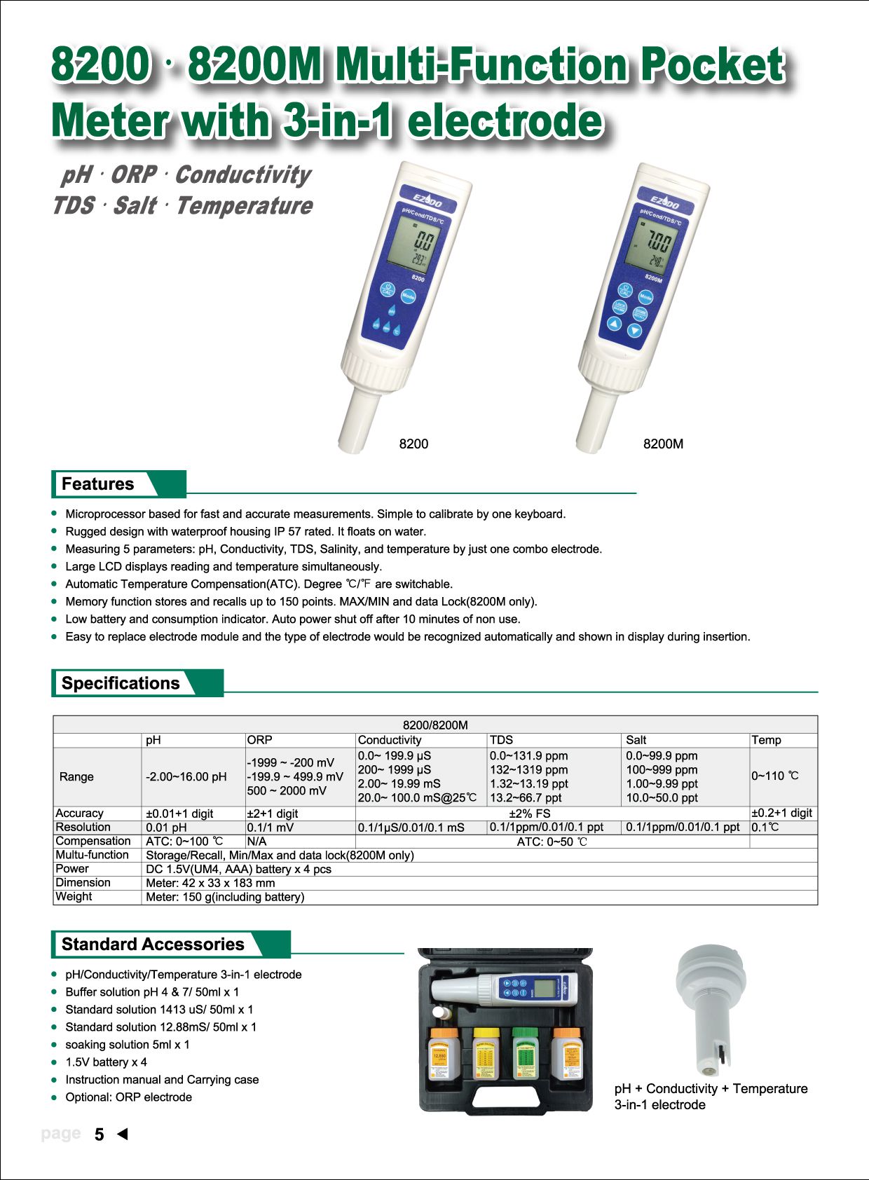 Accessories: pH/Conductivity/Temperature 3-in-1 electrode,Buffer 7.00 x 50ml,Buffer 4.01 x 50ml,1413μS x 50ml,12.88mS x 50ml,Soaking solution x 5ml,Instruction manual,carrying case,AAA battery x 4 (installed in the meter).