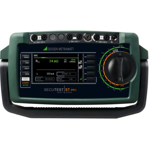 Protective Conductor Resistance (RPE): 10 A AC test current (Feature G01).