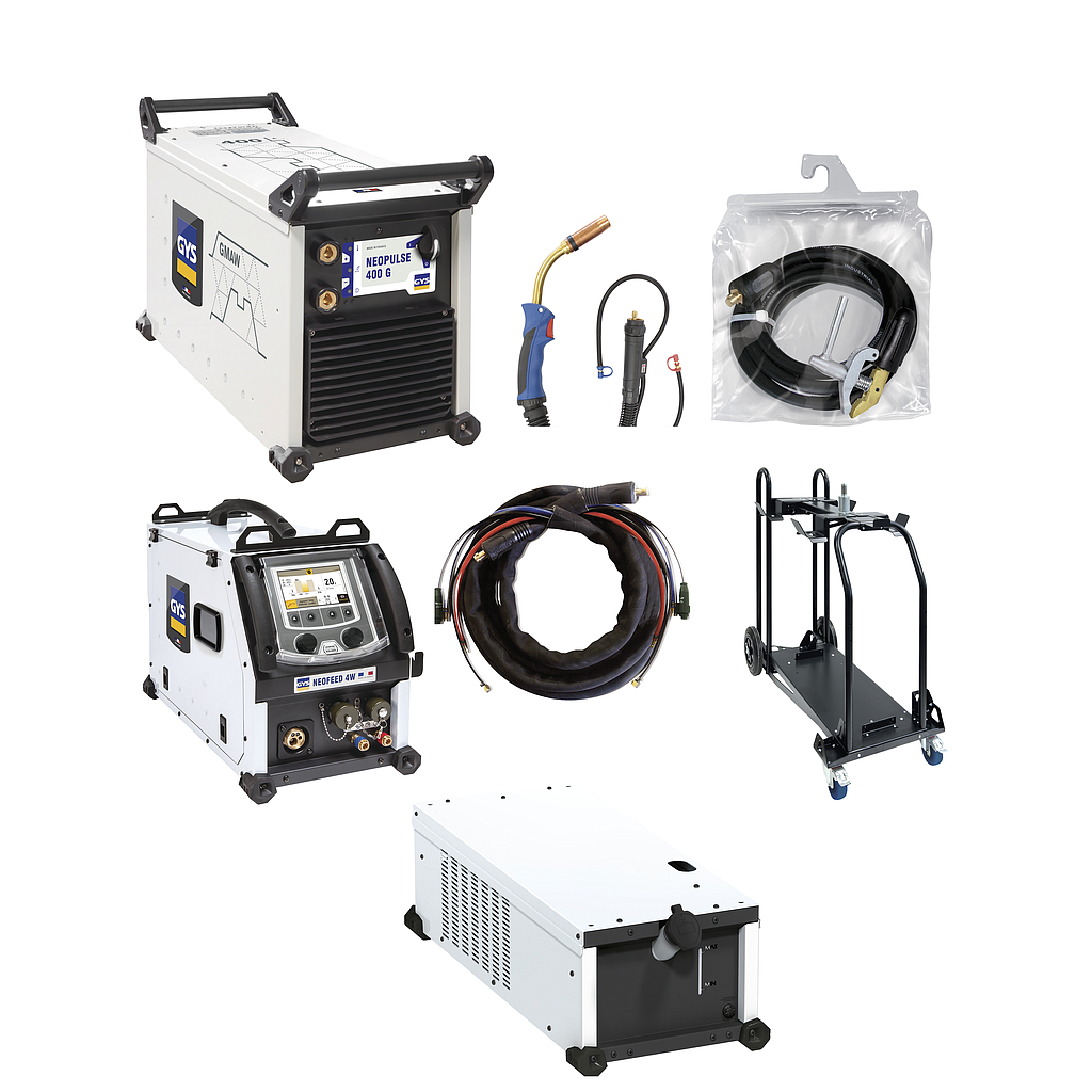 Digital technology, the NEOPULSE 400 G is a pulsed MIG/MAG welding power source with a separate wire feeder. Ultra high performance and designed for the highest performance level using the latest technology, it features +100 synergic curves and exceptional arc quality/performances. Intuitive and highly functional, its digital interface allows you to change welding parameters with ease. Equipped with its NEOFEED-4W reel (optional), this welding power source provides productivity and quality of unmatched welding on all types of alloys.