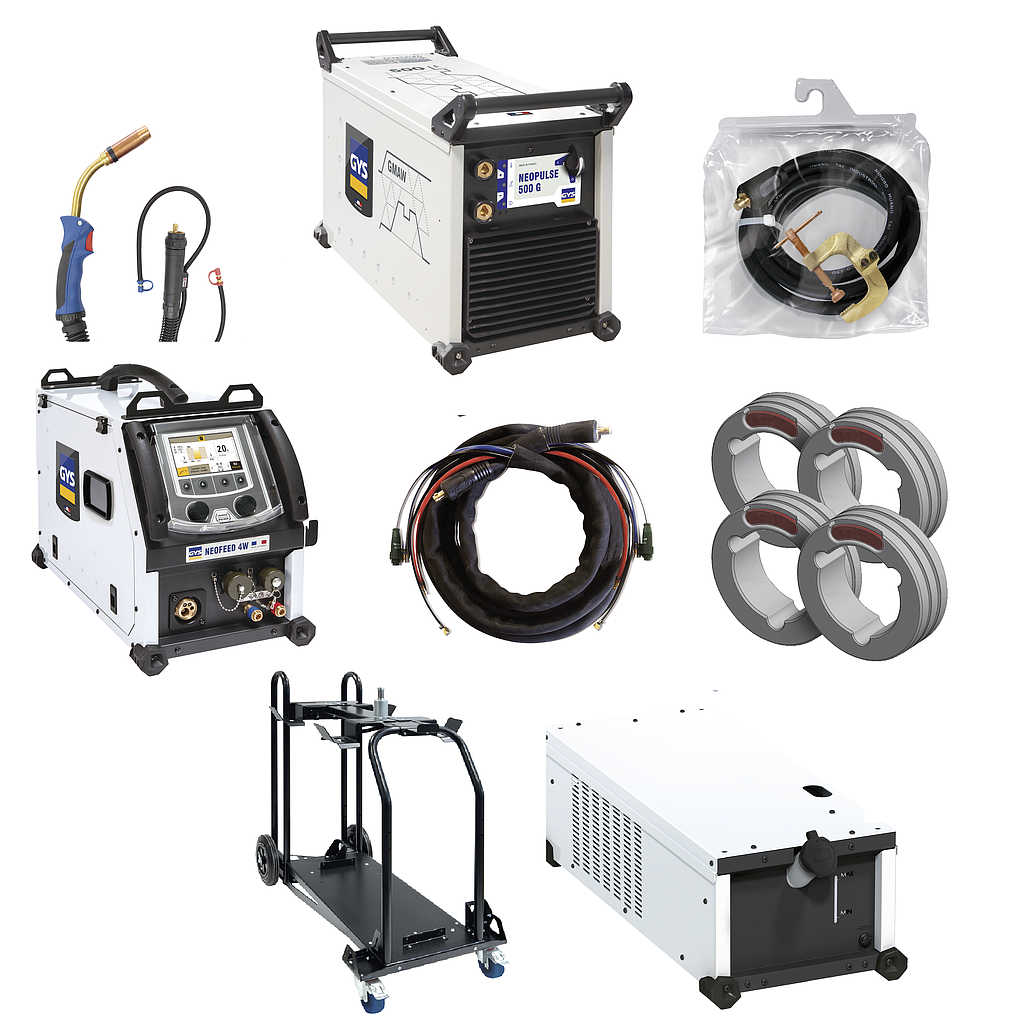 Digital technology, the NEOPULSE 500 G is a pulsed MIG/MAG welding power source with a separate wire feeder. Ultra high performance and designed for the highest performance level using the latest technology, it features +100 synergic curves and exceptional arc quality/performances. Intuitive and highly functional, its digital interface allows you to change welding parameters with ease. Equipped with its NEOFEED-4W reel (optional), this welding power source provides productivity and quality of unmatched welding on all types of alloys.