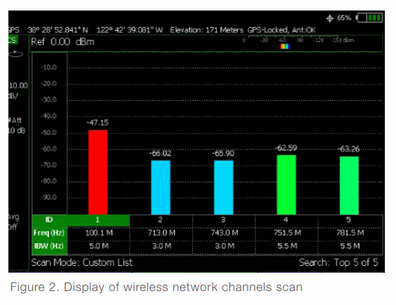 All hospitals have different layouts and are built with numerous specialized construction materials. This makes it extremely difficult to provide good wireless signal coverage throughout the hospital building. The Fieldfox is able to show channel power measurements to verify signal coverage, identify potential interference issues, and optimize network performance (Figure 2). Each channel can be custom set with different frequencies and bandwidths for multiple signal analysis. This capability is useful for technicians performing wireless signal network coverage tests and interference analyses.