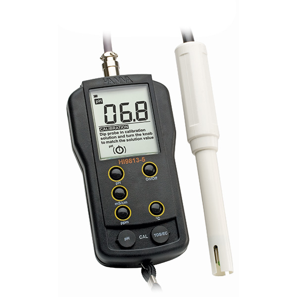 Order Information: HI 9813-5 is supplied with HI 1285-5 multiparameter probe, HI 70007 pH 7.01 calibration solution sachet, HI 70442 1500 ppm (mg/L) calibration solution sachet, HI 70031 1413 µS/cm calibration solution sachet, HI 700661 electrode cleaning solution sachets (2), battery, instructions and rugged carrying case.
