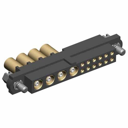 Harwin M80-4C11205F1-04-307-00-000 Power to the Board Datamate 2-Row Mix-Tek Female Crimp Connector, Hexagonal slotted jackscrews, 12 x Small Bore (24-28 AWG) signal contacts, 4 x 2.7mm Crimp Coax