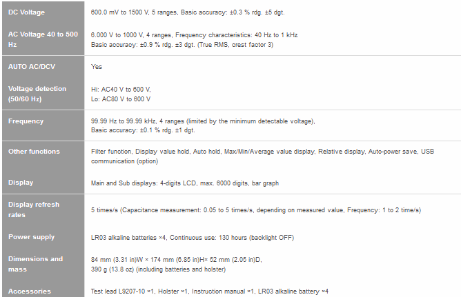 DC Voltage: 600.0 mV to 1500 V; ±0.3 % rdg. ±5 dgt.