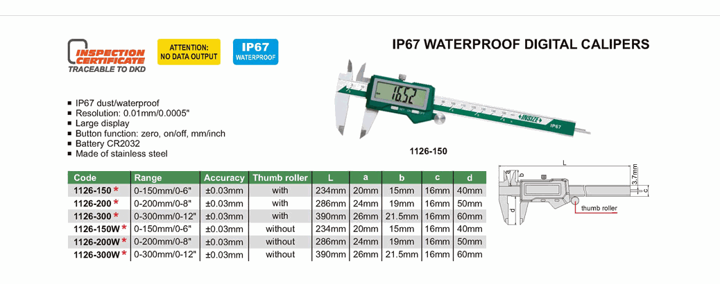 INSIZE 1126-300W IP67 Waterproof Digital Caliper (0-300mm/0-12”; 0.01mm/0.0005”) | EMIN.CO.ID
