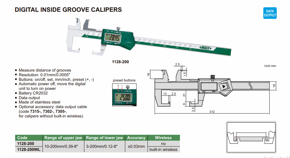 INSIZE 1128-200WL Digital Inside Groove Caliper (10-200mm/0.39-8”; 3-200mm/0.12-8”; Built-in wireless) | EMIN.CO.ID
