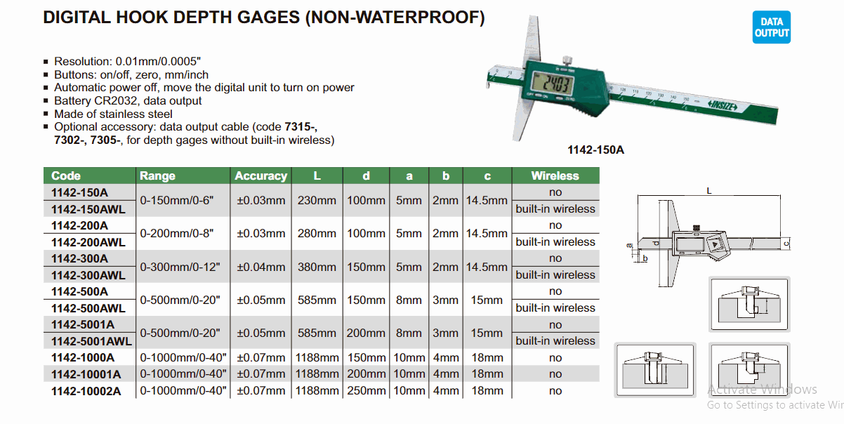 INSIZE 1142-150AWL Digital Hook Depth Gage (0~150mm; Hook 5x2mm) | EMIN.CO.ID
