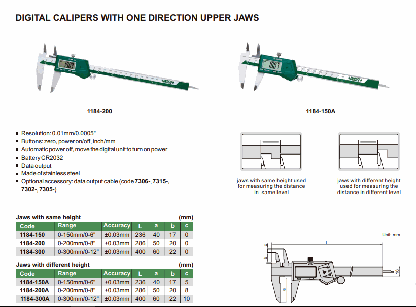 INSIZE 1184-300A Digital Caliper With One Direction Upper Jaws (0-300mm/0-12”; 0.01mm/0.0005”) | EMIN.CO.ID
