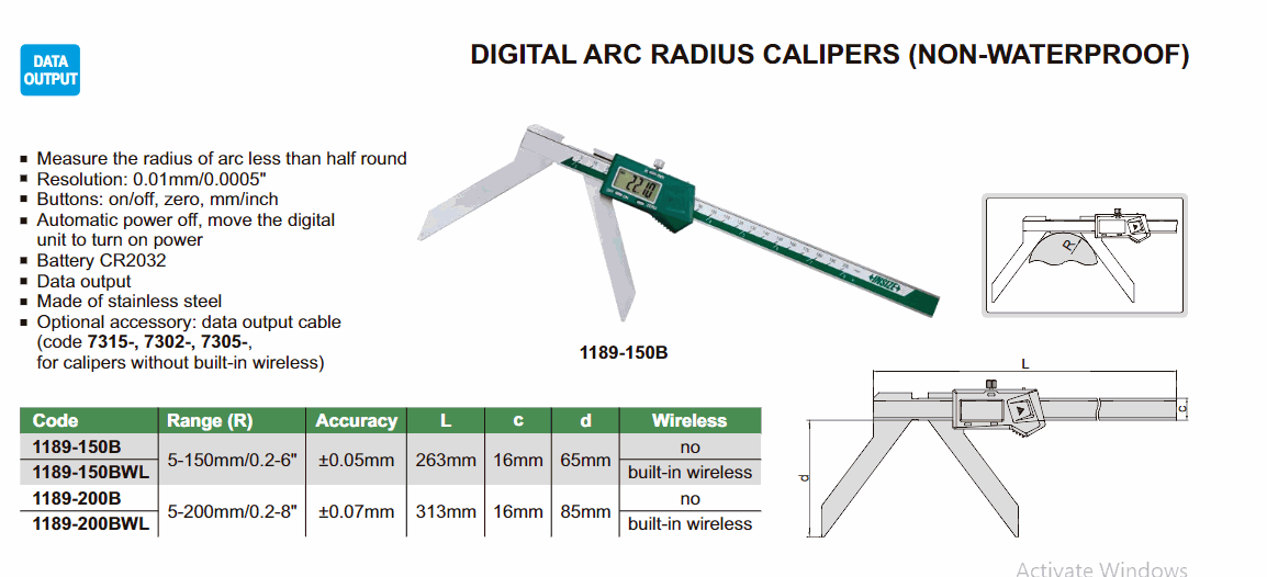 INSIZE 1189-150BWL Digital Arc Radius Caliper (5~150mm; Built-in wireless) | EMIN.CO.ID