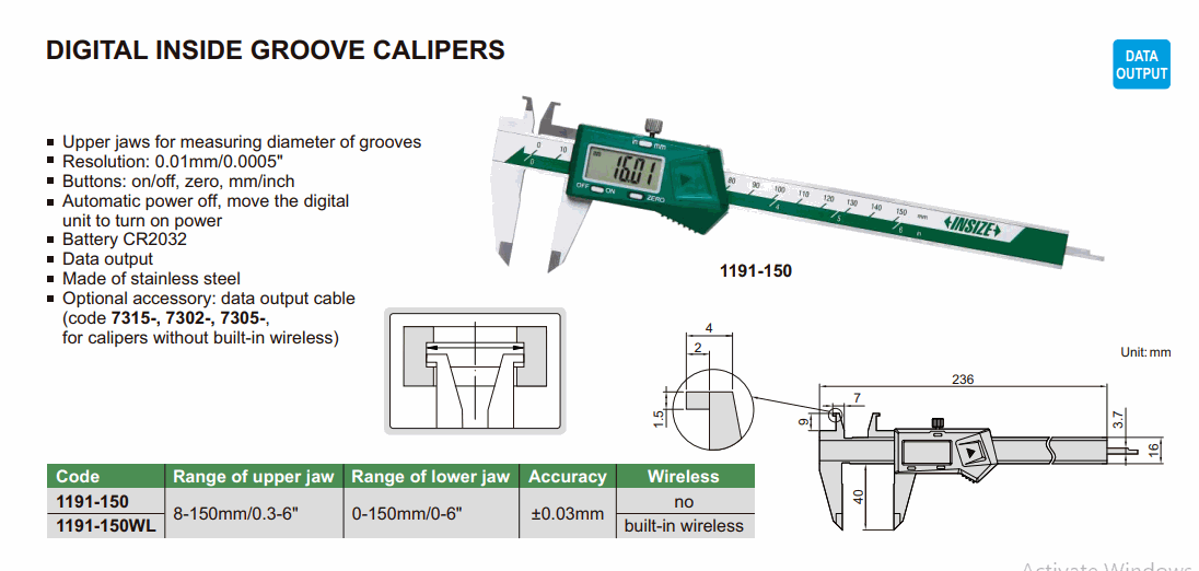 INSIZE 1191-150WL Digital Inside Groove Caliper (8-150mm/0.3-6” or 0-150mm/0-6”; Built-in wireless) | EMIN.CO.ID