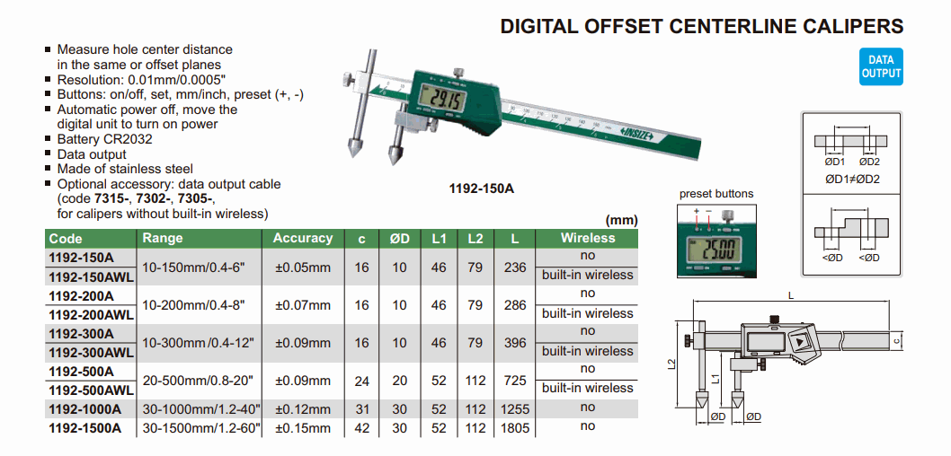 INSIZE 1192-500AWL Digital Offset Centerline Caliper (20-500mm/0.8-20"; 0.01mm/0.0005"; ±0.09mm) | EMIN.CO.ID