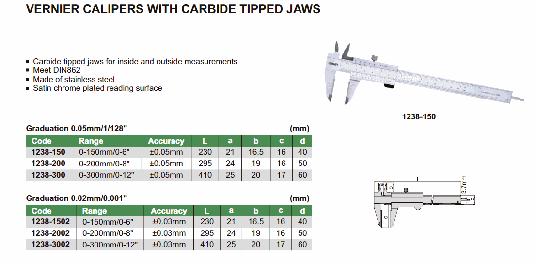 INSIZE 1238-2002 Vernier Caliper With Carbide Tipped Jaws (0~200mm; 0.02mm) | EMIN.CO.ID