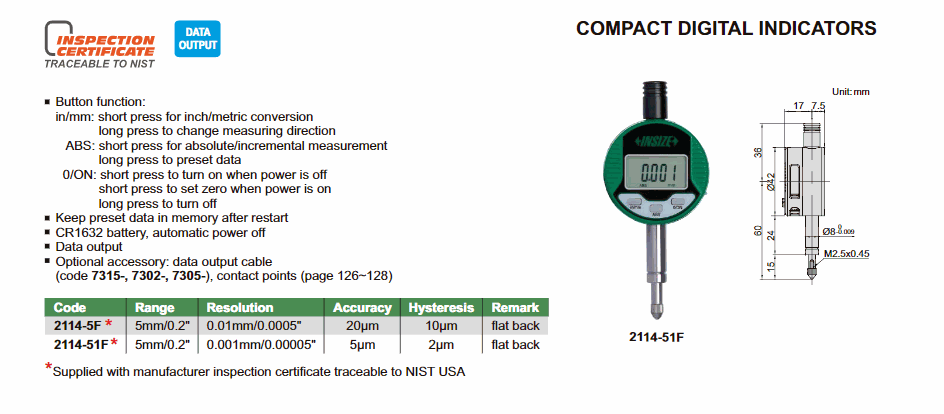 Resolution: 0.01mm/0.0005"