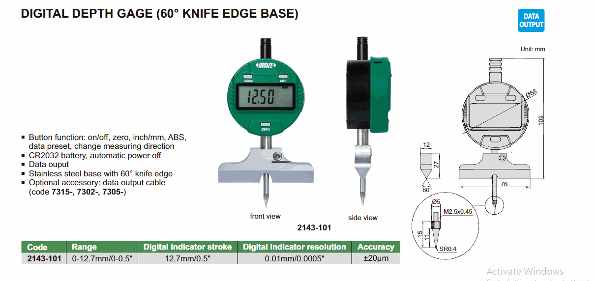 INSIZE 2143-101 Digital Depth Gage (60° knife edge base) (0~12.7mm/0~0.5") | EMIN.CO.ID