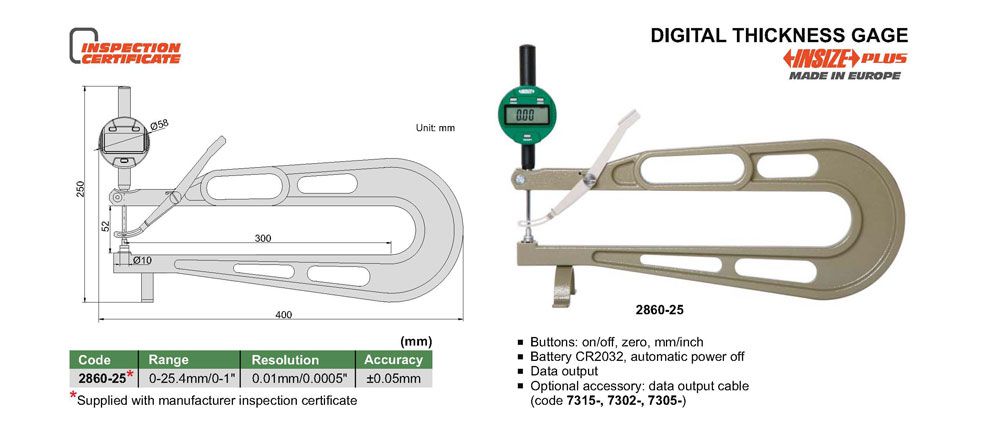 INSIZE 2860-25 Digital Thickness Gage (0-25.4mm/0-1", ±0.05mm, 0.01mm/0.0005") | EMIN.CO.ID