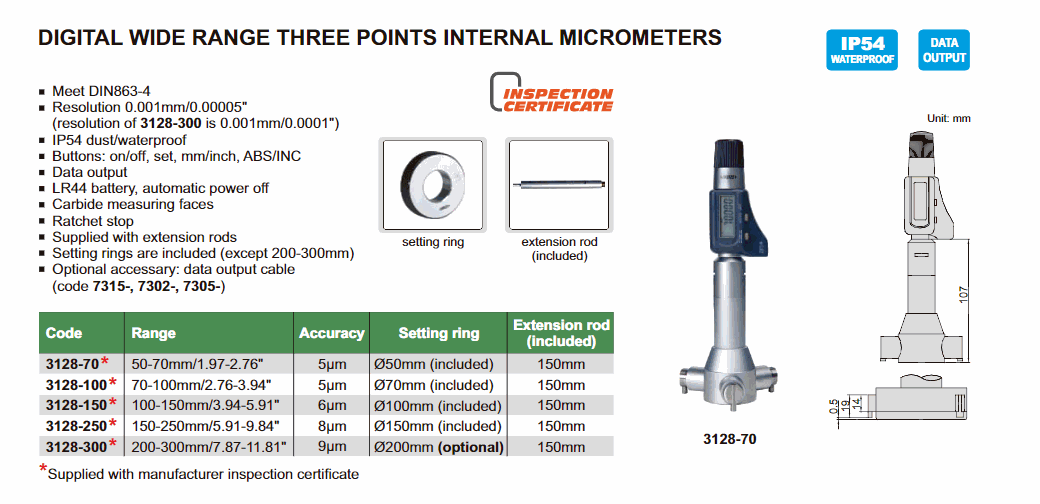INSIZE 3128-300 Digital Wide Range Three Points Internal Micrometer (200-300mm/7.87-11.81") | EMIN.CO.ID
