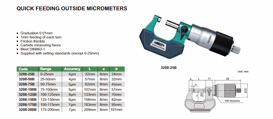 INSIZE 3208-50B Quick Feeding Outside Micrometer (25-50mm; 0.01mm; Accuracy: 4µm) | EMIN.CO.ID