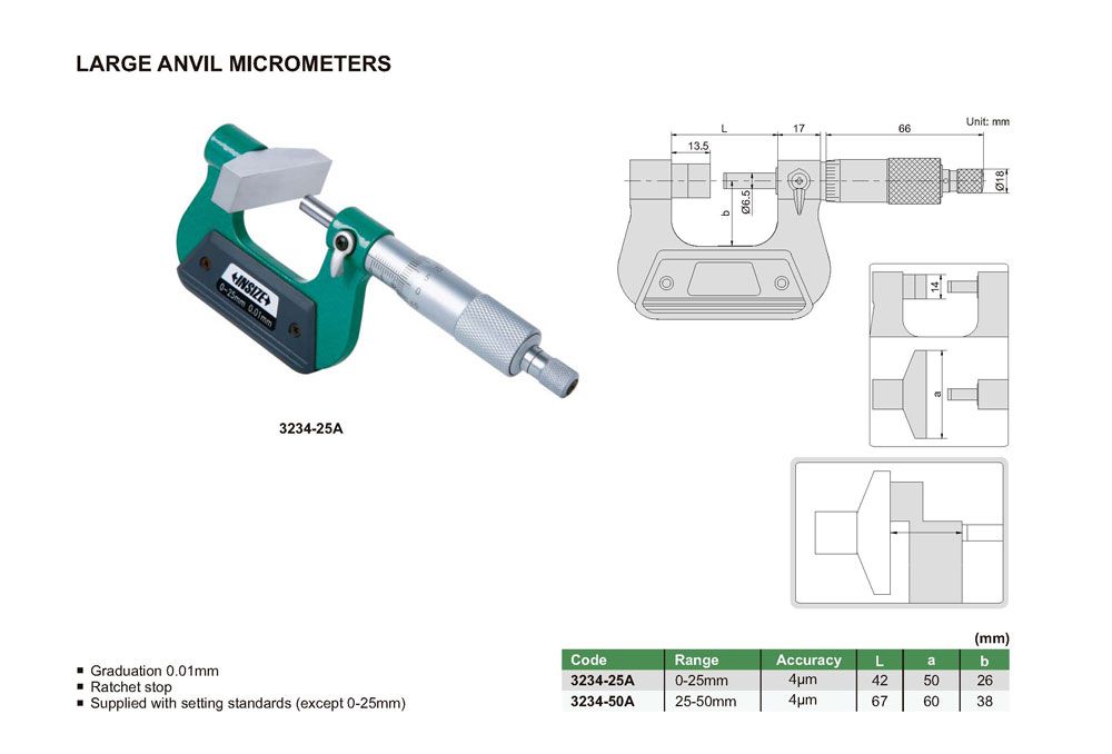 INSIZE 3234-25A Large Anvil Micrometer (0-25mm; 0.01mm) | EMIN.CO.ID