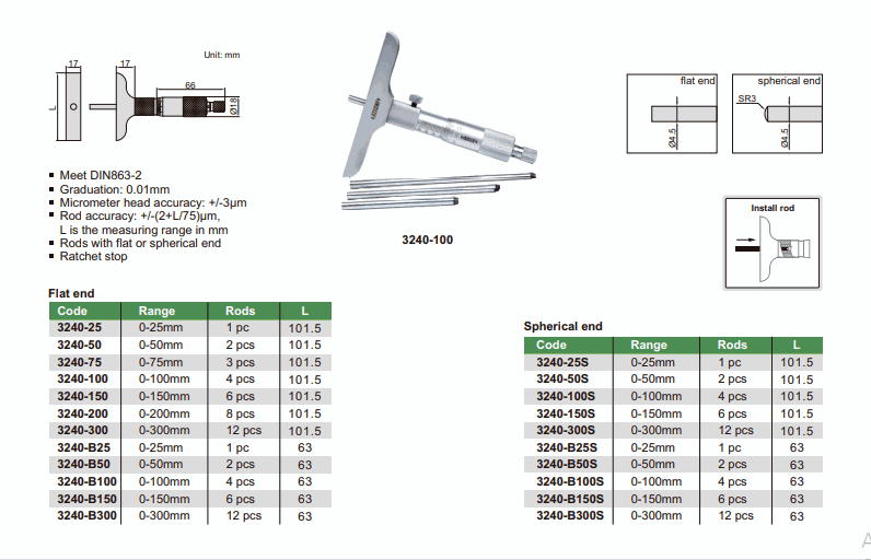 INSIZE 3240-150S Depth Micrometer (0-150mm; 0.01mm; Spherical end) | EMIN.CO.ID