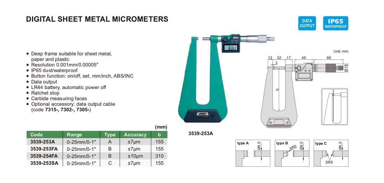 INSIZE 3539-254FA Digital Sheet Metal Micrometer (0-25mm/0-1") | EMIN.CO.ID