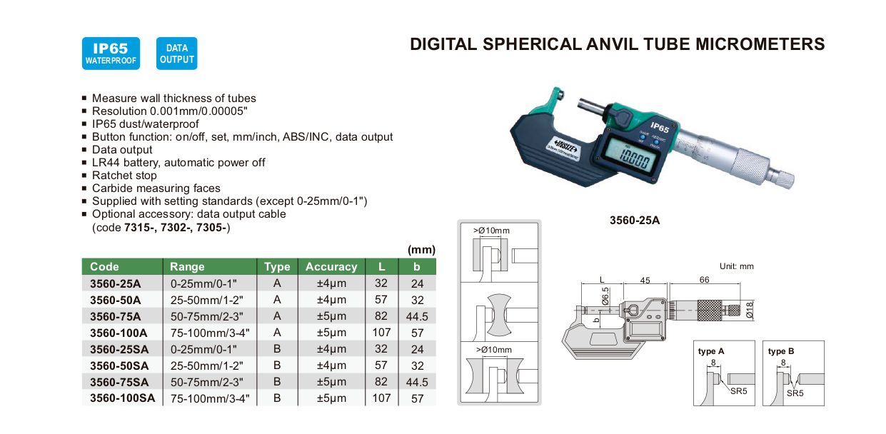 INSIZE 3560-25SA Digital Spherical Anvil Tube Micrometer (0-25mm/0-1") | EMIN.CO.ID