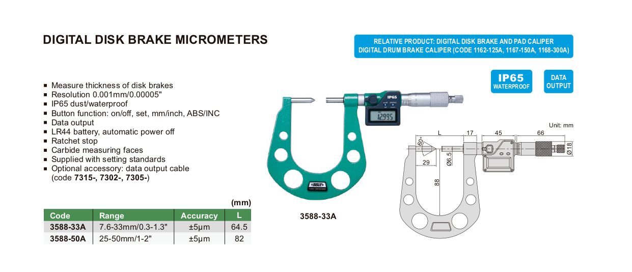 INSIZE 3588-33A Digital Disk Brake Micrometer (7.6-33mm/0.3-1.3") | EMIN.CO.ID