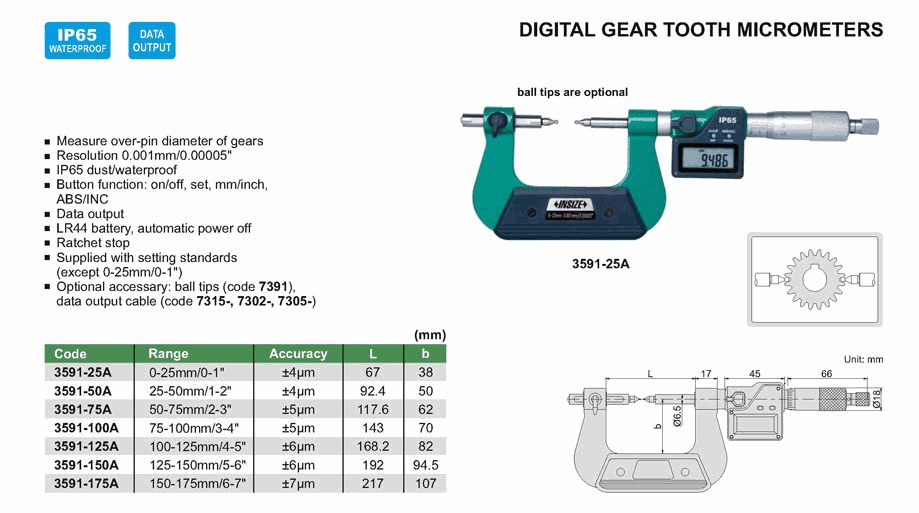 INSIZE 3591-75A Digital Gear Tooth Micrometer (50-75mm/2-3") | EMIN.CO.ID