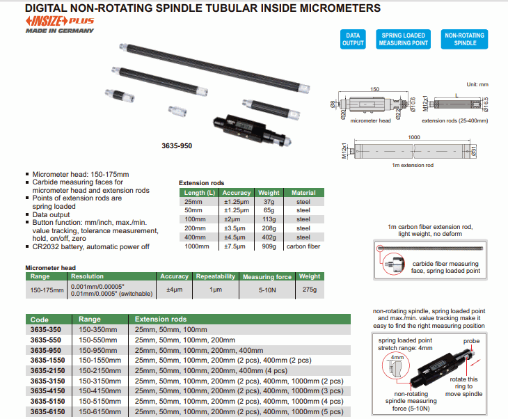 - Resolution: 0.001mm/0.00005” or 0.01mm/0.0005” (switchable)