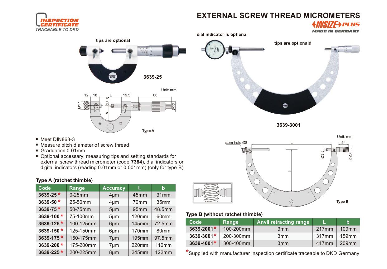INSIZE 3639-50 External Screw Thread Micrometer (25-50mm; Ratchet thimble) | EMIN.CO.ID