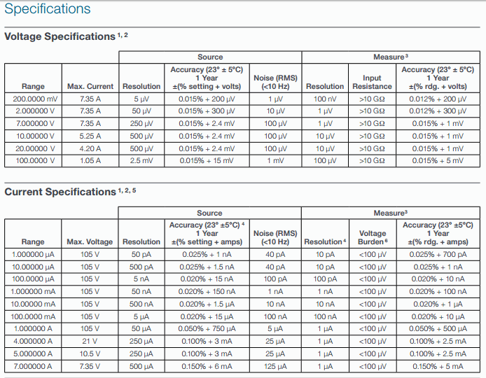 Isource: ±7.35 A (≤7 V range), ±5.25 mA (≤10 V range), ±4.2 A (≤20 V range), ±1.05 mA (≤100 V range).