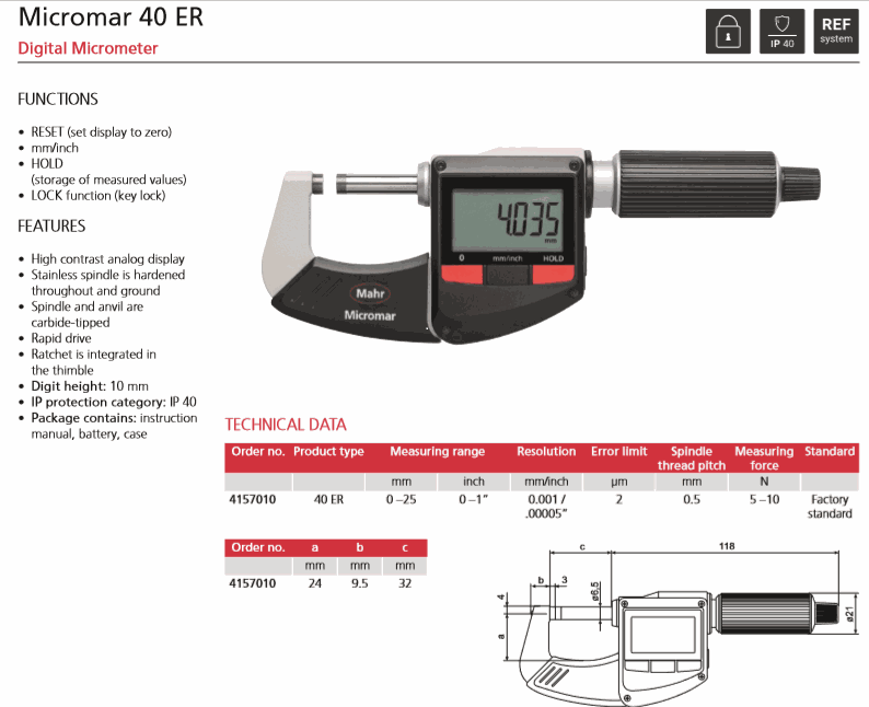 Mahr 4157010 Digital Micrometer (40 ER, 0-25mm/0-1") | EMIN.CO.ID