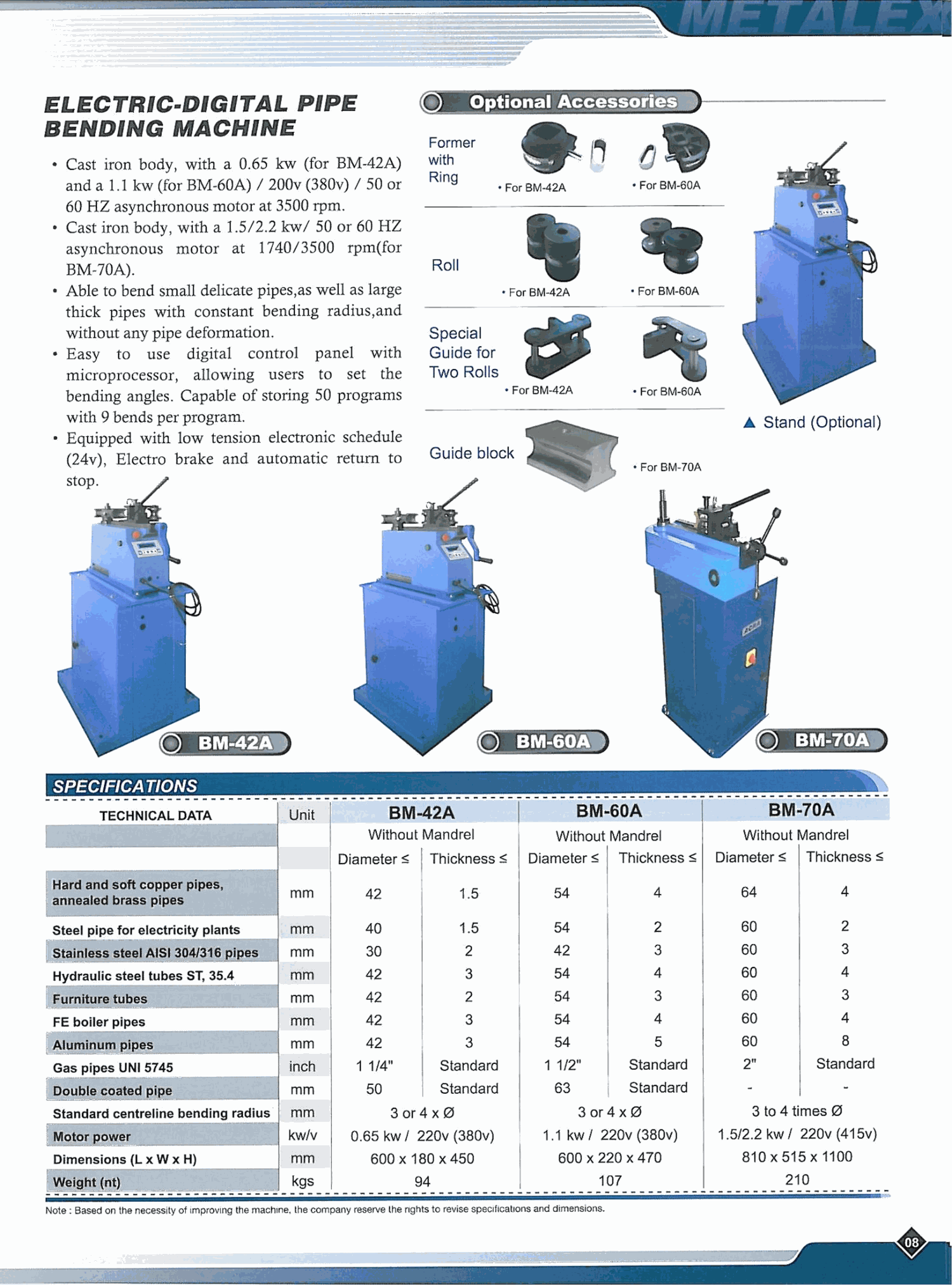Aluminum pipes(mm): Diameter ≤ 54; Thickness ≤ 5
