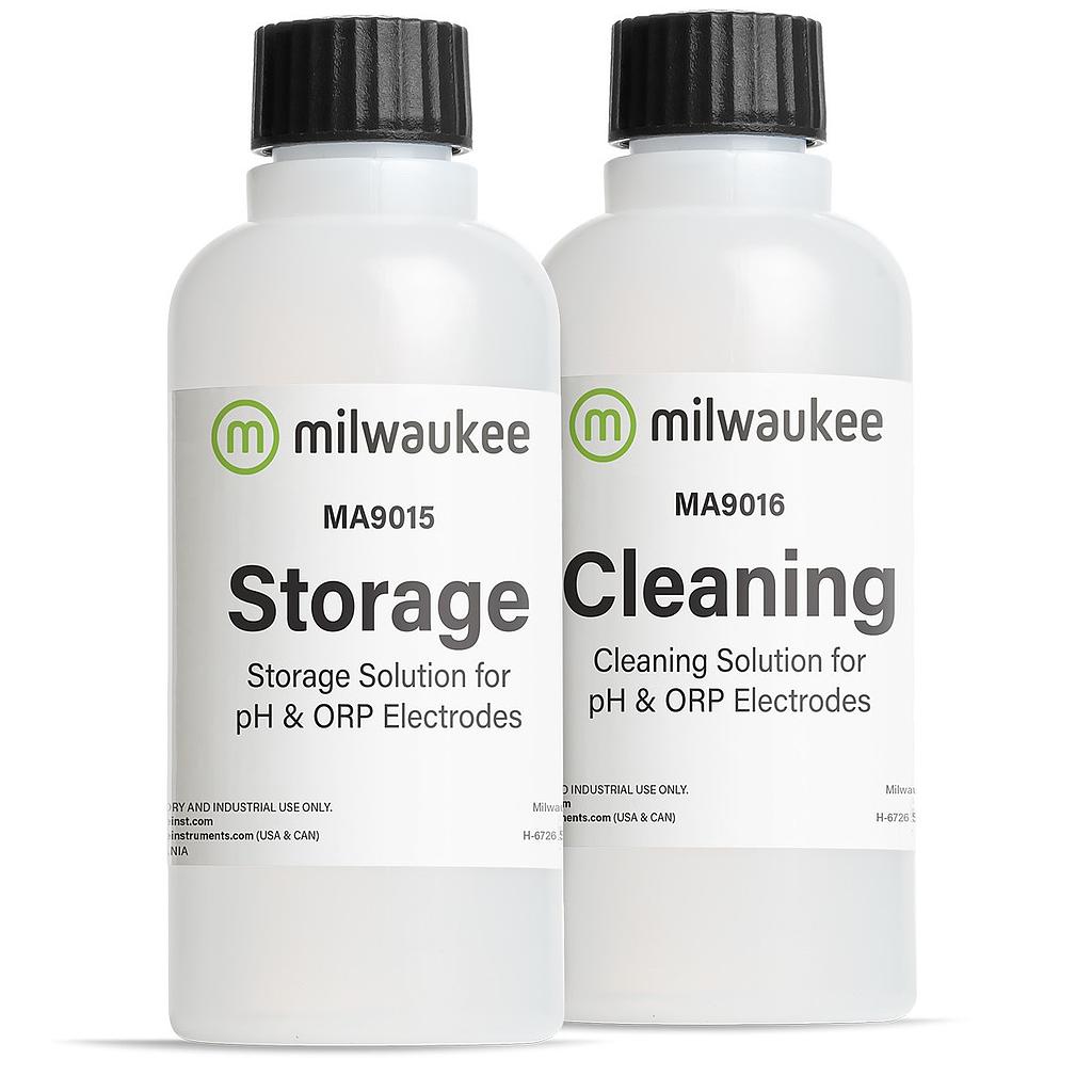 Included in the kit is storage solution (MA9015) and pH cleaning solution (MA9016) for pH/ORP electrodes. Both bottles are 230 mL.