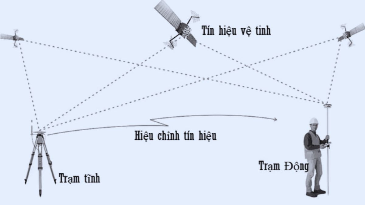 The base station receives satellite signals and transmits correction data to the rover through radio or internet communication. The rover directly processes carrier phase data and displays coordinates immediately on the controller.