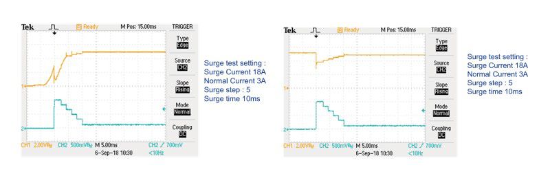4. The capacitive load and sudden hot Plug-in test of power supply at startupThe power input circuit of the electronic circuit usually has many high-capacity capacitors, so the output of the power supply will have an instantaneous starting current when the power is turned on. The 3310G series has a unique surge current test mode, which can provide instantly up to 200% load specification current (example: 3311G continuous current specification 60A and maximum surge current can be tested to 120A) Test time up to 2000 ms, can be used to power the power supply or charger connected to the electronic circuit at boot. The instantaneous starting current of the simulated load is used to test whether the output voltage waveform of the capacitive load meets the requirements when starting up, as shown below.